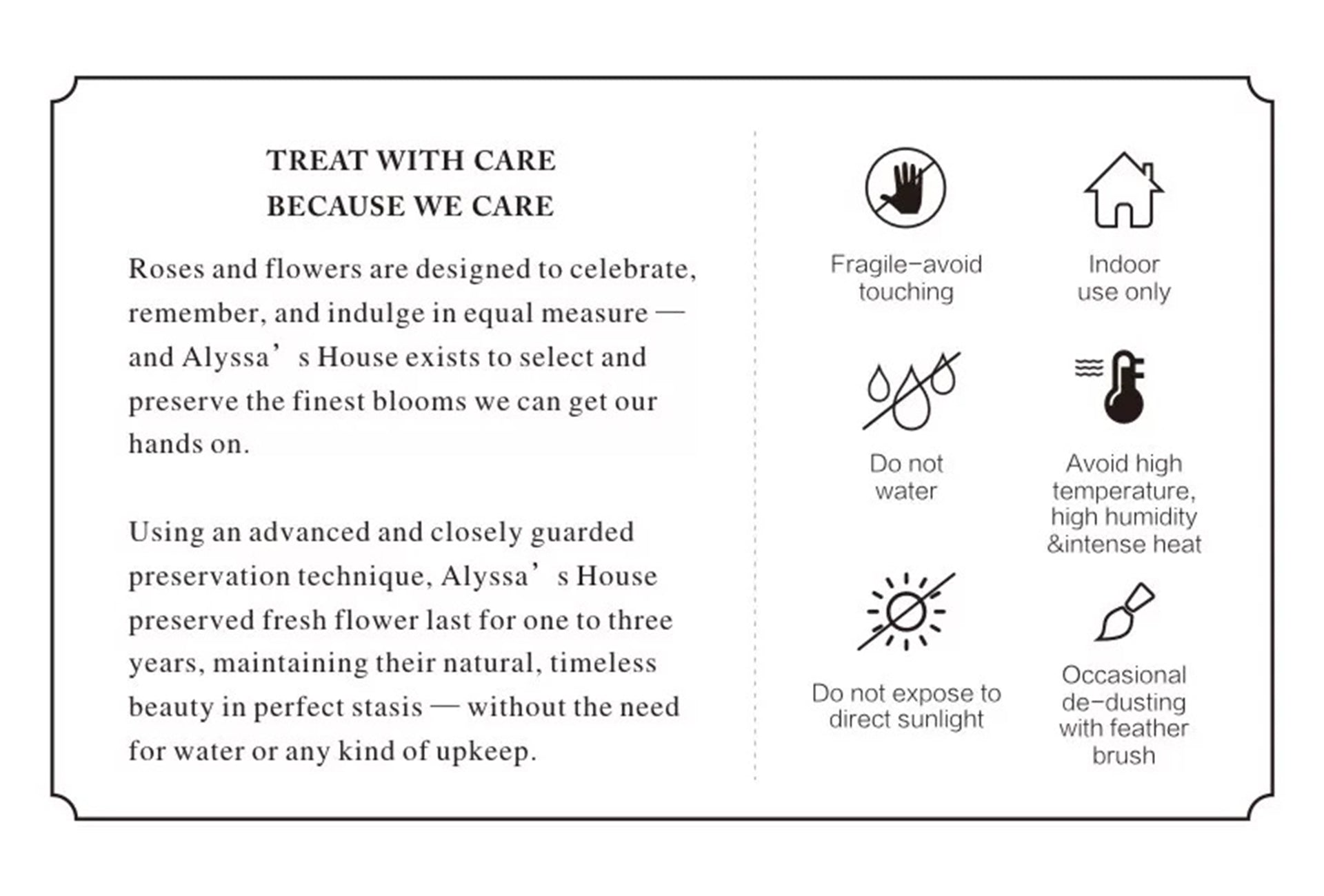 All our roses are naturally Preserved Roses. Preserved roses are made from fresh roses. With the help of advanced science and technology, we are able to preserve and add complementary pigment, while maintaining their fresh look and soft petals. A preserved rose is different from a fresh rose in many aspects, for example, preserved roses can last for years without water or sunlight, however they are grown in exactly the same way in dedicated farms catered to nurture their blossom.