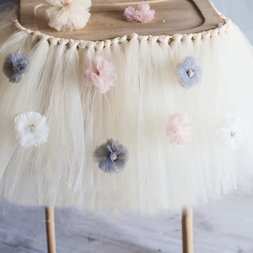 Tulle high chair skirt – a delicate handmade tutu with floral details, ideal for cake smash photoshoots or a memorable first birthday celebration.