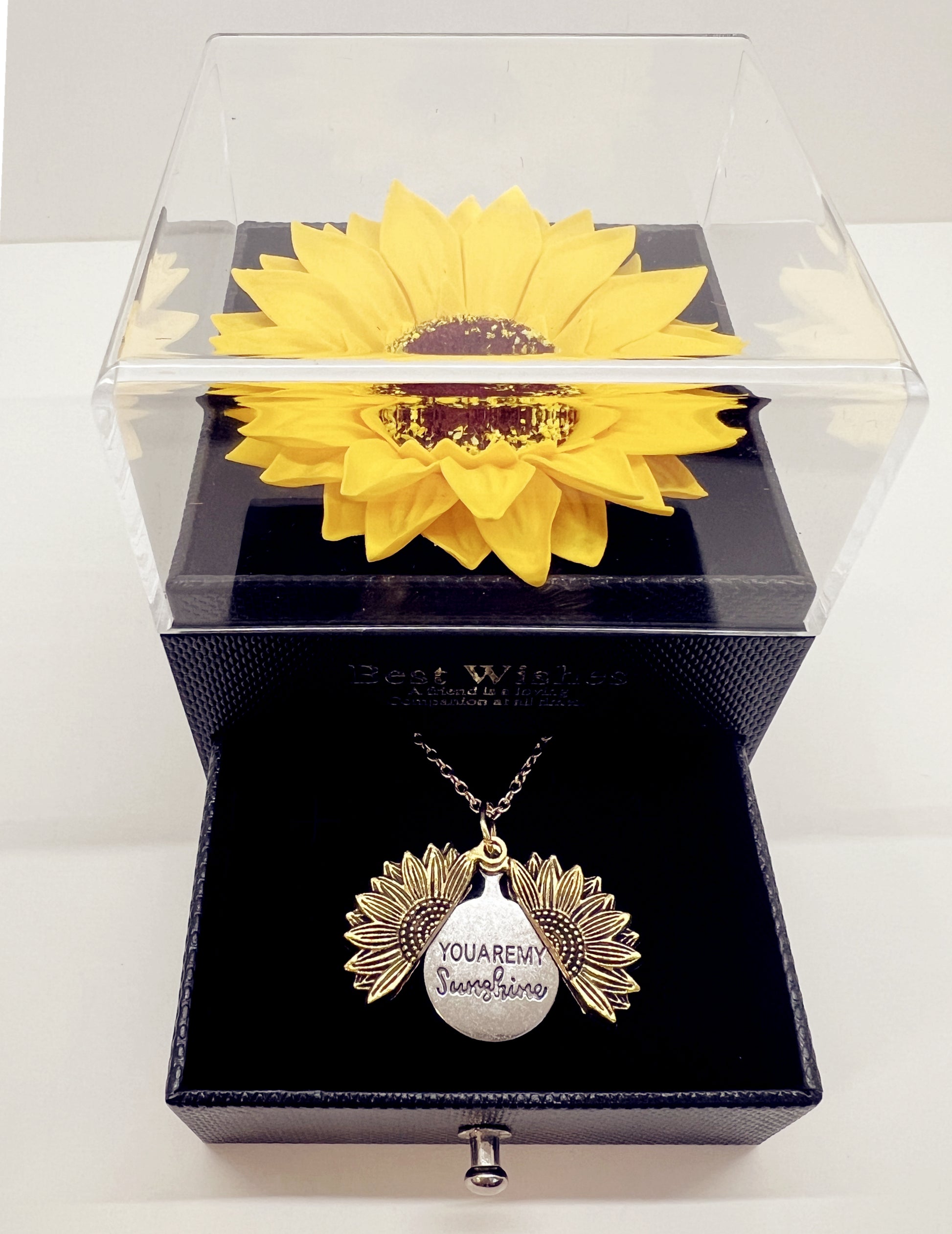 This elegant black gift box features a pull-out drawer to hold your selected necklace. Choose from two stunning designs: a vintage-style locket engraved with “You Are My Sunshine”, or a glittering sunflower pendant with rhinestone petals and green leaf details.